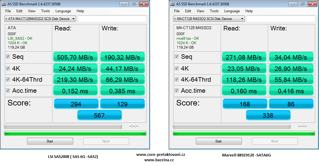 s identickym diskem .... v porovnání sračkoidní rádoby-kvazi, SATA 600 řadič (Marvell 88SE9120 na karte Asus U3S6), vs. serverový DELL PERC H200 (LSI SAS2008) SAS 6G-SAS2-SATA 600 řadič